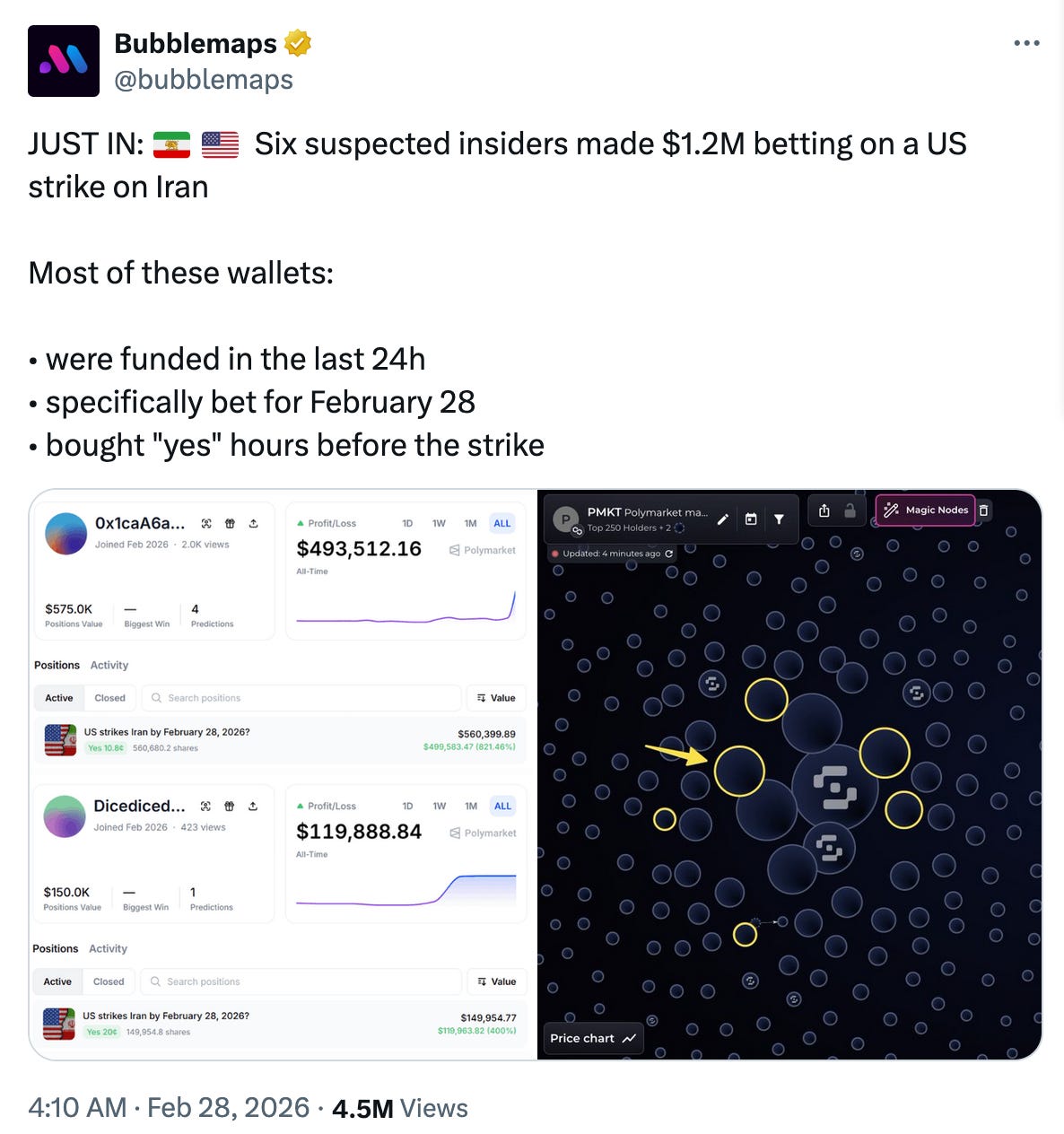 Bubblemaps noted that “six suspected insiders” made $1.2 million betting on a U.S. strike on Iran.